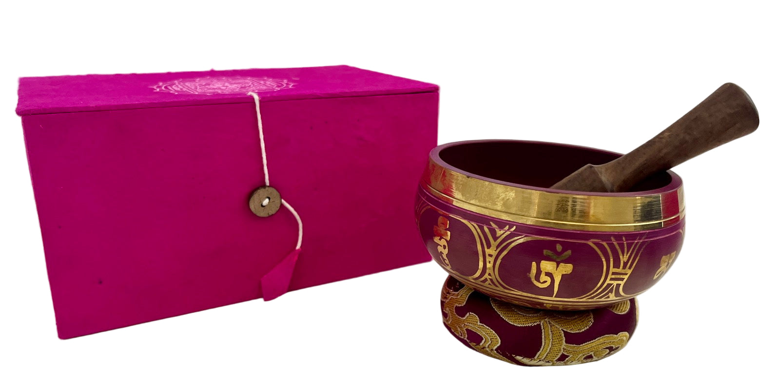 Decorative singing bowl with gold patterns on a pink box, featuring branding text.