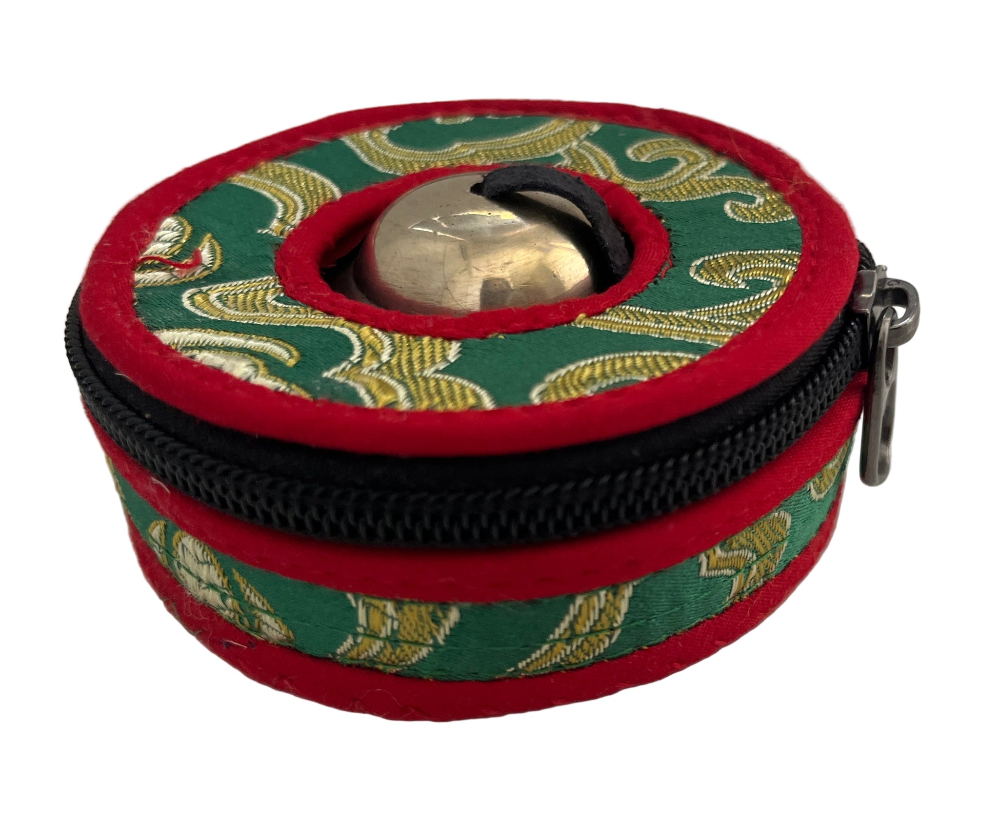 Tingsha bell is small cymbals used in prayer and rituals. Two cymbals are joined together by a leather strap. The cymbals are struck together producing a clear and high pitched tone.